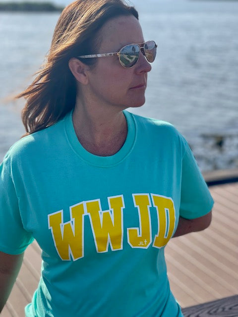 WWJD, Mint and Yellow, Unisex Short Sleeve, Jerzees Adult Dri-Power Active T-shirt